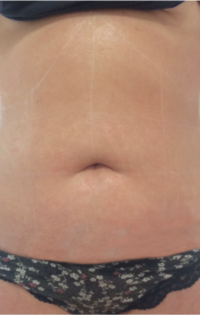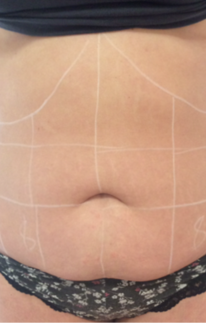 Piel antes del tratamiento: ondulaciones, con pocas fibras de colágeno, grasa subcutánea y septos fibrosos.